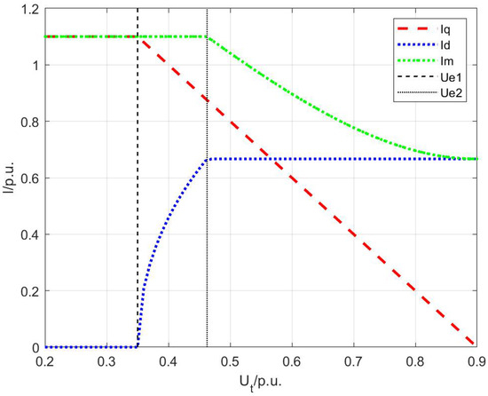Taking a wind farm as an example, according to grid connection standards [23], when the voltage at the connection point drops to 20% of the nominal voltage, the wind turbine should remain connected to the grid. During symmetrical faults, the requirement for reactive current during the low-voltage ride-through period is given by: