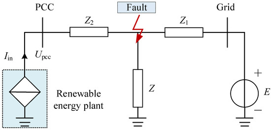 When a short-circuit fault occurs outside a renewable energy plant, the plant can be considered as a large voltage divider impedance. At this point, the voltage drop at the grid connection point of the renewable energy plant is related to the fault impedance and the system impedance [25,26]. The schematic diagram of an external fault in a renewable energy plant is shown in Figure 3.