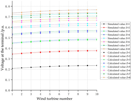 At t =1 s, a three-phase short-circuit fault is applied, with the fault point located at the red arrow in Figure 6. The fault lasts for 0.5 s. The equivalent impedances of line segments AB and BC are (0.4860 + 1.3820 j) Ω and (1.9440 + 5.5280 j) Ω, respectively. Different fault impedances are set, and the steady-state fault voltage at the terminals of each wind turbine is calculated using the methods proposed in Section 3. The results are compared with the simulation outcomes, as shown in Figure 7 and Table 3. The steady-state SCC injected into the fault point by the wind farm is provided in Table 4.