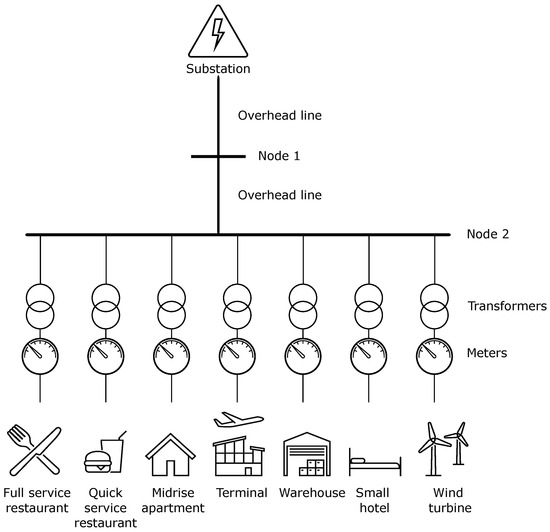 More specifically, the distribution energy system is modeled by GLD and consists of a substation, a GLD object for TESP power metrics, and serves six buildings and a wind turbine that are connected to node 2, as illustrated in