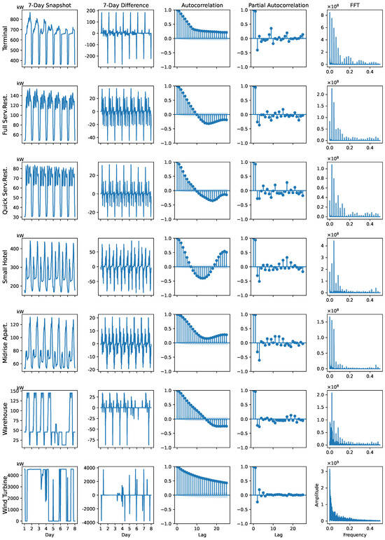 The final column displays the frequency domain analysis using fast Fourier transform (FFT), which reveals the dominant frequencies in the series. Strong peaks are evident for series with clear periodicity, such as daily cycles, confirming the influence of recurring patterns. However, for the warehouse and wind turbine, the FFT plots lack dominant frequencies, further emphasizing their irregular and unpredictable nature. In general, the visualizations in