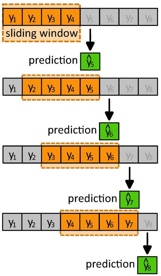 The proposed forecasting method is applied as a monthly prediction. A predetermined number of time steps are chosen as the retained data. The expression “retained data” refers to a set of previous true values used for the projection of the future value. During each prediction phase, the retained data set is updated using the sliding window method by adding the next actual value. This adjustment, implemented by the prediction algorithm, estimates the value of the subsequent step, as shown in