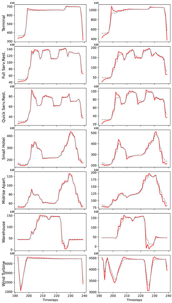 Figure 6 provides a detailed visualization of the energy consumption patterns in different categories, highlighting their temporal characteristics. The first column shows the original time series over a 7-day period, revealing distinct patterns such as daily periodicity and seasonality in most cases, especially for the terminal, full service restaurant, quick service restaurant, small hotel, and midrise apartment. In contrast, the warehouse and wind turbine exhibit irregular and erratic behavior with no consistent cycles.