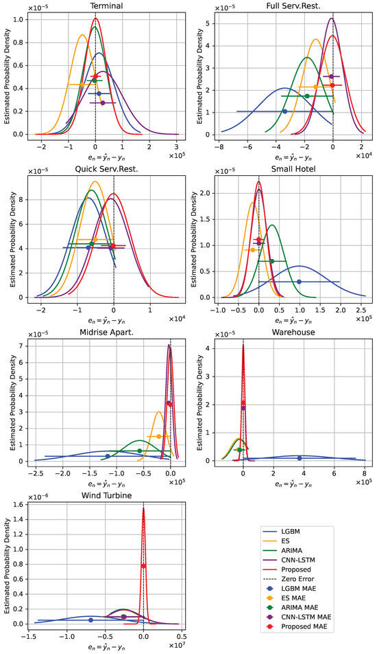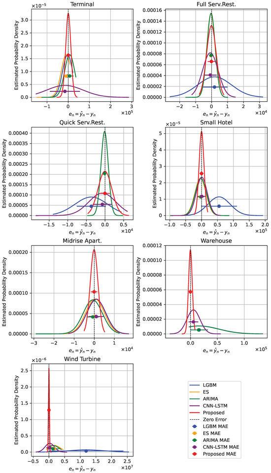 Figure 10 depict the error distribution plots, which effectively showcase the relative performance of the proposed methodology, consistently exhibiting superior accuracy and robustness in comparison with other methods. It is important to note that the suggested approach consistently demonstrates error forecasting distributions that are more tightly clustered around the zero-error line. This observation suggests that the prediction capability of our proposed methodology is more reliable when applied to various time series data sets, especially when compared with established baseline models. In particular, for complex elements like the wind turbine, the proposed method exhibits enhanced performance, demonstrating its robustness and dependability in varied contexts. These outcomes underscore the proposed method’s effectiveness in delivering more accurate and consistent forecasts.