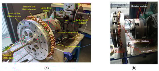 Figure 2a shows the experimental test bench used to measure motor torque as a function of rotor position. The stator was mounted on the bench free to rotate around its bearing. In