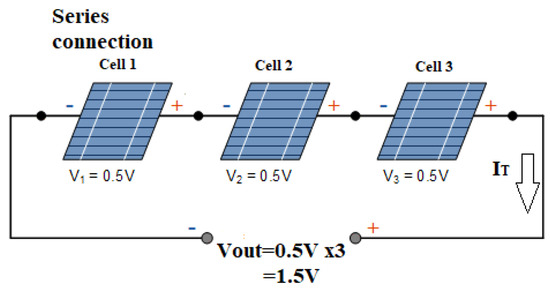 A photovoltaic effect is used by photovoltaic cells to convert sunlight into voltage. When a load is connected across a PV array, the PV array will supply electricity to the load while drawing current from the device [24]. To create current flow in an external circuit, n-type and p-type materials are used in the building of the PV array. Photons are absorbed by PV cells as a result of the light’s collision with the material. A single cell can only provide a voltage between 0.5 and 0.8 volts, which is insufficient to power the load. To enhance the voltage and current, several cells are linked in series and parallel, respectively, as shown in Figure 2 and Figure 3.