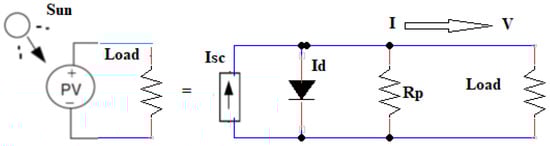Figure 4 shows a straightforward circuit for a solar cell that can produce electricity, with a real diode running in parallel with a perfect current source. The supplied current varies in direct proportion to the solar cell’s flux of direct sunlight [27]. The genuine PV cell’s current-voltage characteristic curve is shown in Equation (2):