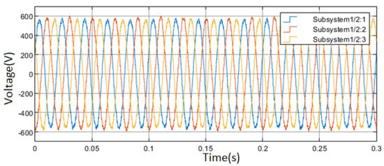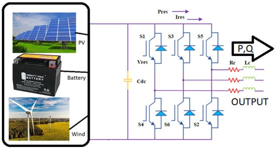 The system circuit that was created is shown in Figure 7. This circuit entails distribution generation, which consists of PV-wind connected to CC-VSI for interface with the grid via a DC-link capacitor that stores energy [48]. The highest power from the PV and wind is retrieved using the extended search algorithm. A reference DC link voltage is generated; then, the IGBT inverter is used to produce AC. When there is no solar energy, the reference DC-link voltage is set to its default value [49]. The AC side of the VSI is connected to an inductive filter. Before the system is connected to PCC, a step-up transformer is used to raise the voltage level. The PCC is coupled to a non-linear uncontrolled rectifier load [50,51]. An inverter control is utilized to reduce the load current harmonics and power factor and control the flow of DG power to the PCC [48].