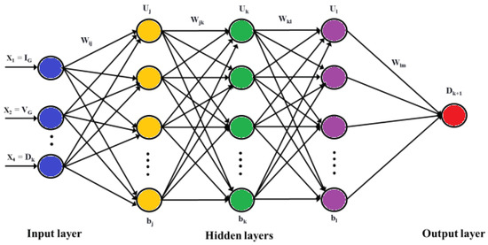 A highly computational model known as an artificial neural network (ANN) can be adjusted to learn input-to-output mappings based on prior data. Figure 10 illustrates the three layers that make up an ANN: the input layer, the hidden levels (computational layers), and the output layer. In ANN, feed-forward propagation and back-propagation are where the computation weight and bias take place. Back-propagation reduces the error between the real and estimated outcomes, but feed-forward propagation accurately estimates the results. The neural network’s input dataset was processed in the input layer. Figure 10 illustrates how (xi) displays the data provided as an ANN input at the beginning of an ANN training process. Each hidden layer of the ANN multiplies the input data by weights and adds it to the bias. The accuracy of the ANN-derived prediction rises with the number of hidden layers. The output layer combines the data from the hidden levels to produce the required result for the program in consideration.