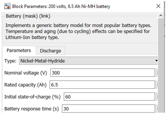 The battery storage main block parameters are shown in Figure 15 below. A nickel-metal-hydride with a rated capacity of 6.5 Ah and a nominal voltage of 300 V is presented. The battery storage is coupled to an average-model DC/DC converter. An essential component of energy storage in a DC microgrid is battery storage. For energy storage, a battery is connected to DC via a bi-directional DC/DC converter. In order to increase efficiency and preserve voltage stability, a microgrid that relies on distributed energy resources must have an energy storage system.