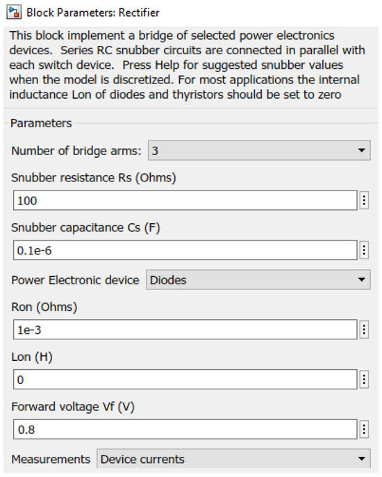 The main block parameters for the PV model are shown in Figure 13. The maximum voltage of 666.6 V is obtained by connecting 22 modules in series at a maximum voltage of 30.3 V. The block parameters display the open-circuit, short-circuit, and current at Pmax values. The current in the short circuit is 8.01 A. The DC microgrid is mostly supplied by the PV system. Using a solar panel, solar energy is converted into electrical power. To replicate DC sources in the system design, PV arrays are coupled via a boost converter. Because it depends on temperature, irradiance, and load characteristics, a PV system’s output voltage is not optimal.