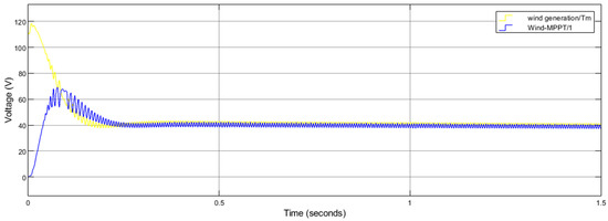 All of the values for the nominal mechanical output power (W) at 0.8 Pu, the base power of the electrical generators (VA), and the base wind speed (m/s) of a wind turbine at 12 m/s are shown in Figure 14, which displays the wind turbine model block parameters. The DC microgrid is also powered by wind energy. The goal of this study is to generate DC output as wind generation (alternating current) is transformed into direct current using a rectifier. There is a clear correlation between wind speed and electricity generation; as wind speed increases, so does power generation. Wind-generated power is always changing. Non-fluctuating power must first be stored in a battery before being applied to the load. The simulation results of wind turbines utilizing PMSG are represented by the Tm and Te which are shown in the simulations.
