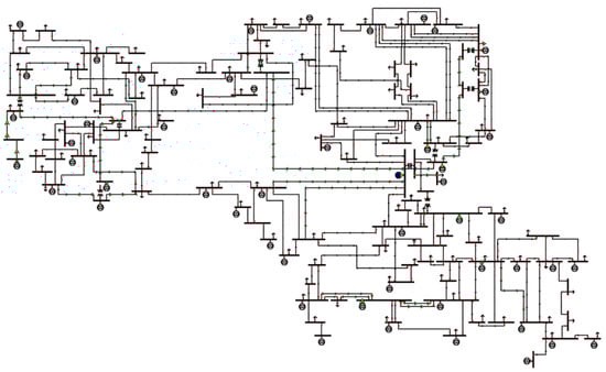 Although we tested all nine formulations on the test cases, for conciseness, here, we only report the results for (i) the nominal case while applying approach (4) vs. (ii) the OTS case by applying (9) on the larger IEEE-118 bus system. We simulated the OPF dispatch using load and generation data for 1 h. This is because we did not observe significant impacts of OTS on the smaller 9-bus and 39-bus systems, indicating that they are not really transmission capacity-constrained. The IEEE-118 bus system consists of 19 generators, 35 synchronous condensers, 177 lines, nine transformers, and 91 loads, shown in Figure 2. These simulations were run using the Gurobi solver in Julia. We assessed the impacts of OTS by examining some important metrics. We can obtain the locational marginal prices (LMP) at each bus as the dual multipliers associated with the real power (P) balance constraints. These are how electricity prices are set in the wholesale market as well. The differences in LMPs across different buses in the network indicate that there is congestion, i.e., the network operation is constrained by the transmission capacity of the lines (power flow limits). The effect of congestion on system performance can be quantified via the congestion rent: