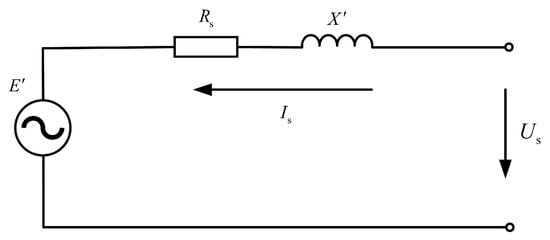 Here, and represent the equivalent internal resistance and transient reactance of the DFIG converter, respectively. The equivalent circuit of the DFIG is illustrated in Figure 1.
