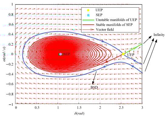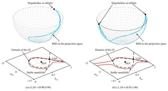 As illustrated in Figure 4, the local BSD is characterized by Equation (29). The blue curve represents the BSD. When the stable manifold fails to form a closed domain (the blue curve extends to infinity in Figure 4), the domain becomes unbounded, causing the BSD to expand indefinitely. In such cases, the system behavior at infinity becomes the primary focus of this investigation.