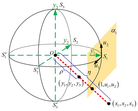 Considering the neighborhood of as an example, we establish new coordinates with fixed at 1. Figure 5 shows diagram of the coordinate neighborhood near . The geometric relationships show that the line connecting the original system point to the origin intersects both the following surfaces:
