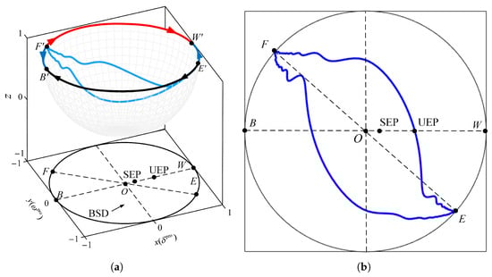 The distribution of the global BSD and SAIs. (a) The global BSD in the projection space. (b) The distribution of the four SAIs: W, B, E, and F. The blue solid line indicates the BSD.