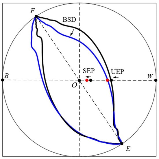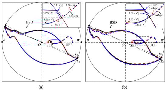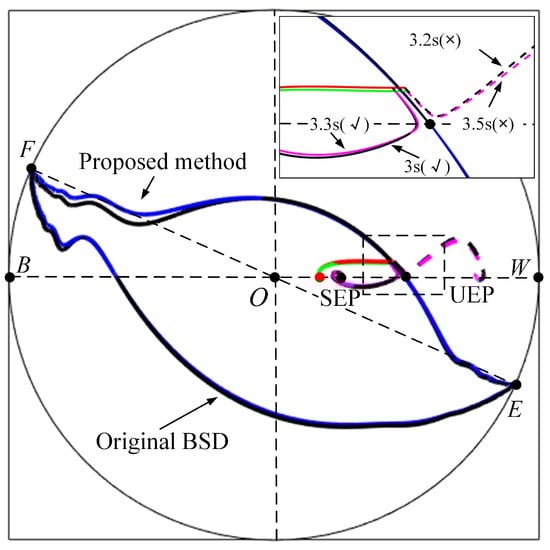 To visually demonstrate the effect of DFIG penetration replacing synchronous generators (SGs) on the BSD, Figure 7 presents the comparison of the BSD before and after DFIG grid connection, where the black curve represents the original SG-dominated BSD and the blue curve shows the contracted BSD after DFIG integration with displaced SEP and UEPs. This boundary contraction visually confirms the stability-weakening effects of DFIG’s negative impedance characteristics and reduced inertia, while simultaneously validating the effectiveness of the proposed BSD characterization method in capturing these stability domain changes. The results provide clear evidence of how renewable integration alters the fundamental stability properties of power systems.