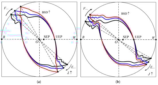 Relationship between parameter variation and BSDs. (a) Relationship between variation and BSDs. (b) Relationship between J variation and BSDs. The black curve represents the original BSD. The blue curve represents the BSD after the first increase in (increase in J). The red curve represents the BSD after the second increase in (increase in J).