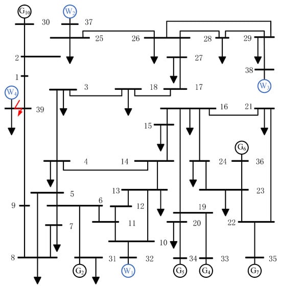 To validate the effectiveness and accuracy of the proposed method, this section establishes a simulation test environment based on practical power system cases, specifically examining scenarios where wind turbines replace thermal power units with quantitative evaluations performed through CCT and settling time measurements. For comparative analysis, the classical energy function (EF) method serves as the benchmark to highlight the advantages of our method, particularly focusing on the differences in fault critical point identification accuracy and transient stability assessment reliability. All simulations are conducted on the MATLAB/Simulink 2022a platform using the IEEE 39-bus system as the test model, whose typical topology is illustrated in Figure 10.