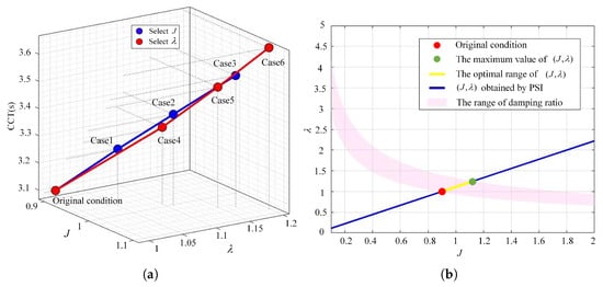 The BSDs and SAIs undergo significant changes during grid faults in wind power grid-connected systems. Since Equation (35) reveals that SAIs depend solely on parameters J and , this study proposes a cooperative parameter optimization method to enhance voltage support capability by adjusting J and . Figure 8 illustrates the topological mapping relationships between BSDs and SAIs under three operational states: (1) the pre-fault system (black curve) with stable equilibrium point SEP-0, , unstable equilibrium point UEP-0, , and critical clearing time (CCT), ; (2) the post-fault system (green curve) featuring SEP-1, , UEP-1, , and CCT, ; and (3) the CCT obtained by the adjustment of system parameters following the principle of singularity invariance (PSI), .