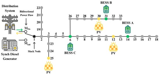 It is important to emphasize that this study does not involve network reconfiguration or system expansion. The electrical infrastructure of the 33-node test system remains fixed throughout. The control variable in the proposed optimization strategy is the power schedule of the BESS units. The objective is to compare different metaheuristic algorithms for their ability to manage BESS operation effectively under two predefined operating modes: grid-connected and islanded.