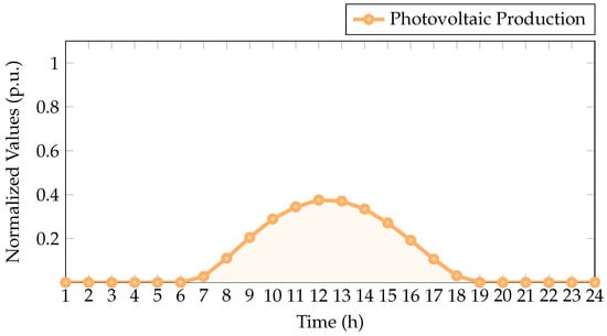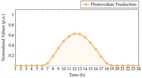 Here, is the maximum active power to be injected by the distributed generator at node i, and is the minimum active power to be injected. This constraint considers the PV generation curve in p.u., determined by the technology used and radiation conditions in the study region, which vary each hour and are represented by .