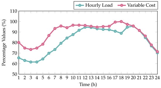 The vector is computed by weighting the nominal power assigned to each node by the normalized hourly demand factor , as given by the demand curve shown in Section 6. The total emissions can be expressed as: