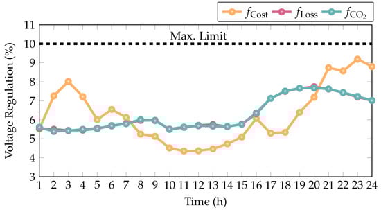 To quantify environmental performance, the model evaluates the total CO2 emissions generated by both conventional generation (CG) and DG units. Let and be the vectors of active power output from CG and DG sources at time h, respectively. Define and as their corresponding emission coefficients, and let represent the DG availability profile.