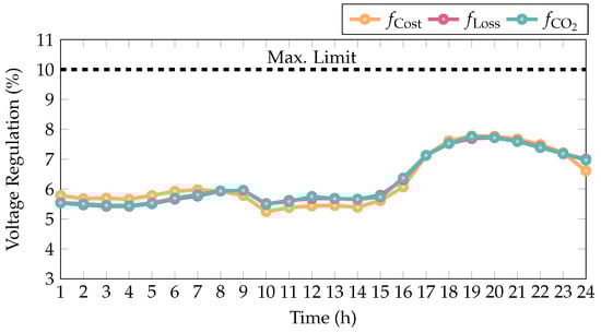 In the case of nodal voltages, Equation (17) ensures that they remain within the limits defined by grid regulations.