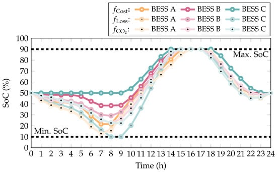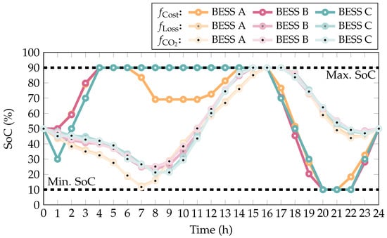 Finally, the SoC must remain within the operational bounds, as stated in Equation (16):