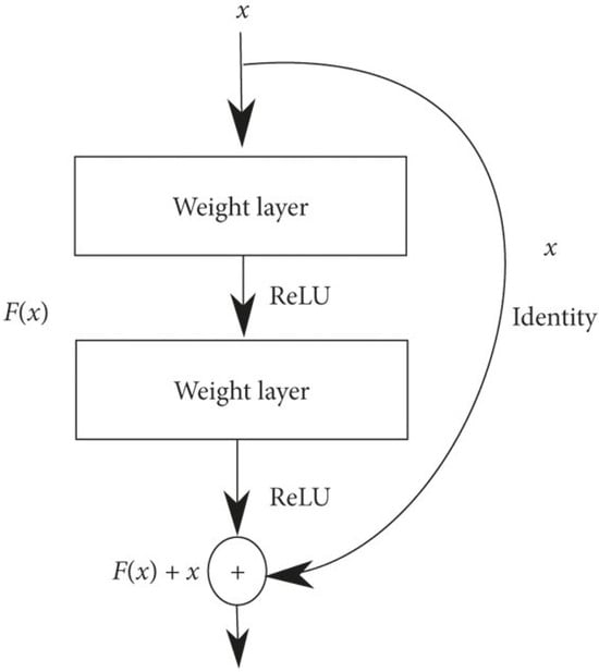 Residual Networks (ResNets) were introduced by He et al. In Figure 4, we can see a simple architecture of the ResNet block [33]. ResNets are a class of Deep Neural Networks designed to enable the training of very deep architectures by mitigating the vanishing gradient problem. The central innovation of ResNets is the introduction of residual connections, or skip connections, that allow the network to learn a residual mapping rather than a direct transformation.