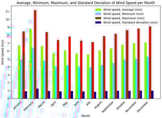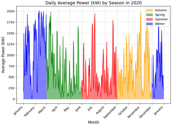 Wind speed is a crucial factor in wind power generation. However, the variability of wind speed poses challenges for consistent and reliable energy production. Figure 7 and Figure 8 represent the performance of the Senvion MM92 2.05 MW wind turbine based on daily average power output and monthly wind speed statistics. Figure 7 represents monthly wind speed statistics, maximum, minimum, and average wind speeds, along with standard deviations. The highest wind speeds are recorded in winter months, especially in February. Figure 8 shows the daily average power throughout the year, categorised by seasons, where winter, represented in blue, consistently produces the highest and most variable power output. In contrast, in red, summer shows the lowest and most stable generation, while spring (green) and autumn (orange) provide intermediate power levels. Visualising such data together allows us to capture the peculiar characteristics of each energy production period immediately. Moreover, in terms of wind energy production, stronger winds in winter and autumn contribute to higher power generation.
