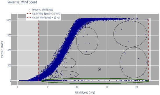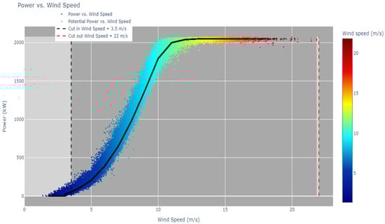 Figure 9 illustrates the power output of the Kelmarsh wind turbine during operational conditions. The figure highlights the detection of abnormal data, specifically Type I and Type II anomalies. The green closed line graphically represents anomalies. In these denoting instances, the power output exhibits negative or near-zero values when the wind speed exceeds the cut-in speed. Additionally, Type II anomalies are depicted by a series of black closed lines dispersed throughout the graph. These types of anomalies (Type II) tend to occur infrequently and are often a result of signal problems, issues related to the sensors, and unusual weather conditions. In Figure 10, the Manufacturing Power Curve is represented by a solid black line, while the cleaned Actual Power Curve is depicted using a continuous colour format.