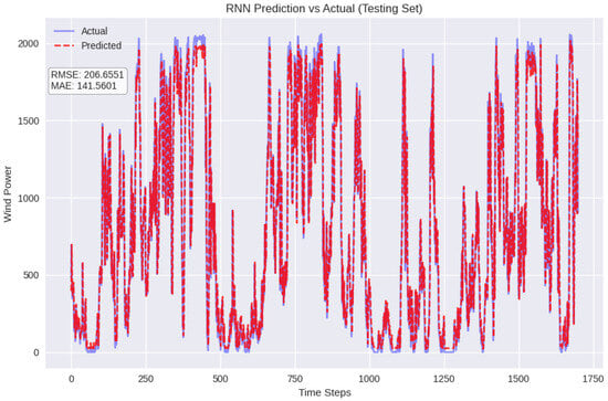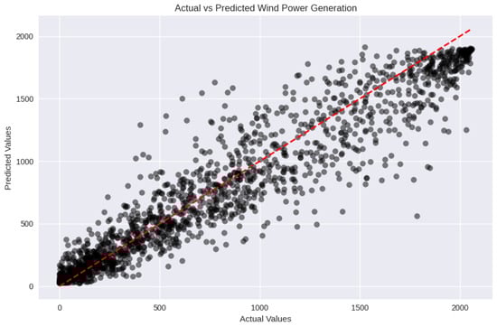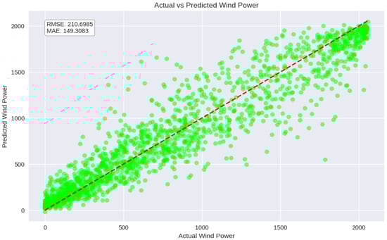 The results demonstrate that all models exhibit robust predictive capabilities, with R2 values exceeding 0.86, indicating solid explanatory power for wind power output variance. The error metrics, notably, the Root Mean Square Error (RMSE), ranging from 206 to 231 kW (approximately 10–11% of maximum turbine output), and the Mean Absolute Error (MAE), between 141 and 162 kW (7–8% of maximum output), underscore the models’ high accuracy in this complex forecasting domain.