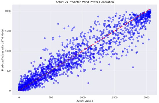 Figure 14 compares the actual and predicted power curves in the test section, and Figure 15 displays the Coefficients of Determination for the LSTM model in the corresponding section. In this Figure, dots on the red dashed line represent perfect predictions. Dots above indicate overprediction, dots below show underprediction, and darker areas show higher density of overlapping predictions.