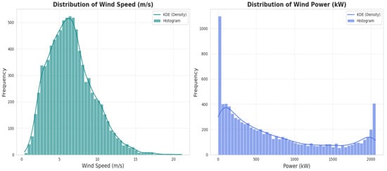 Considering the parameter, we first plot the wind speed and power distributions to observe their skewness. Based on the distribution, we determine the value of , identifying whether the data are right-skewed () or left-skewed (). The parameter of , with a range of , controls the asymmetry or skewness of the distribution. Negative values indicate left-skewed distribution, while positive values suggest right-skewed distribution. For our analysis, was limited to the range as negative values were not relevant for this case since both wind speed and wind power, according to Figure 18, show right-skewed distributions. So, what we have is the parameter considered within the range , while the parameter is constrained between 0 and 1, reflecting distributions with moderate to heavy tails and right-skewness.