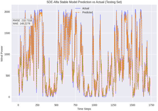 Figure 19 compares the actual and predicted power curves obtained using the SDE-Alpha Stable model in the test section. In Figure 20, the red dashed line marks where predictions would be perfect, meaning the predicted and actual values are exactly the same. Points above the line indicate that the model overestimated the actual values, while points below the line indicate underestimation. It is important to note that the alpha () and beta () parameters for the current figures are and .