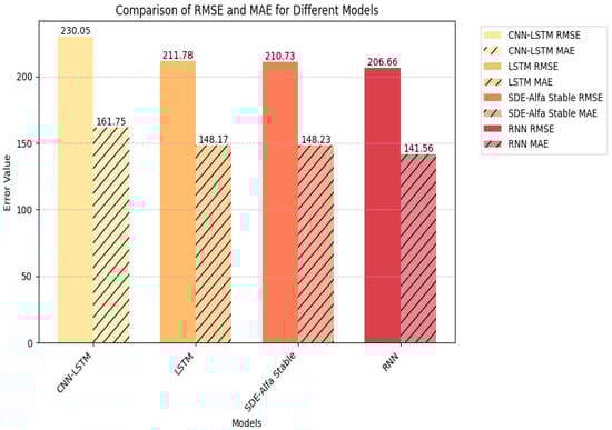 From Figure 21, the results for all models show that RMSE values range between 206 and 230 kW, corresponding to approximately 10–11% of the maximum power output (2050 kW). MAE values range from 141 to 162 kW, representing about 7–8% of the maximum power. The difference between the RMSE and MAE for each model indicates the presence of some larger errors or outliers, as the RMSE is more sensitive to significant errors. The model performance ranked from best to worst based on the RMSE shows that the RNN performed the best with an RMSE of 206.66 and an MAE of 141.56. This is followed by the SDE-Alfa Stable model with an RMSE of 210.73 and an MAE of 148.23, and the LSTM (Long Short-Term Memory) with an RMSE of 211.78 and an MAE of 148.17. The CNN-LSTM had the highest errors, with an RMSE of 230.05 and an MAE of 161.75.