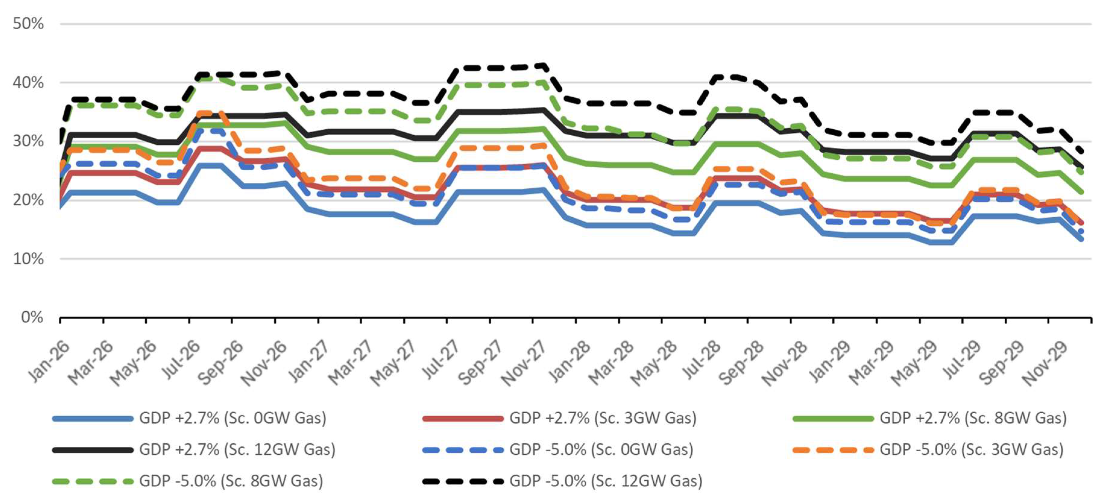 For this simulation, in 2026, the additional expansion of gas thermoelectric plants was set at 0 GW, 3 GW, 8 GW, and 12 GW, totaling four supply sensitivity scenarios. The increments of 3, 8, and 12 GW of gas-fired capacity correspond to policy-relevant magnitudes: 3 GW reflects a single large auction round, 8 GW is the is the amount provided for by law 14182 [