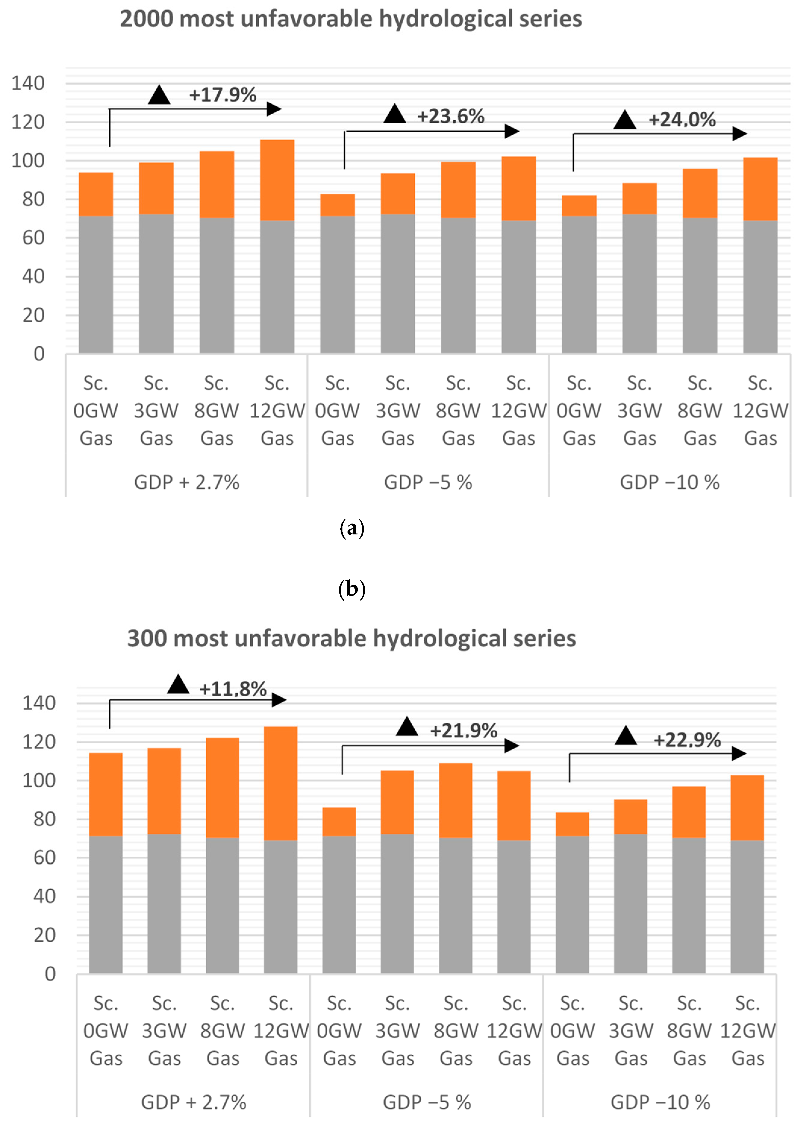 Figure 7 summarizes the results obtained, showing operating (orange column) and investment (grey column) cost portions for four options of the hydrological series set analyzed—the 2000 (a), 300 (b), 200 (c), and 100 (d) most unfavorable hydrological series—comparing the impact of carrying out lower demand than that used for system expansion planning—Low Dem. and +Low Dem.— for four supply scenarios tested with different profiles in terms of dispatch flexibility—Sc. 0 GW Gas, Sc. 3 GW Gas, Sc. 8 GW Gas, and Sc. 12 GW Gas The four supply scenarios differ in the amount of expansion of inflexible natural gas thermoelectric plants. By setting this thermal expansion, there is naturally an impact on the investment decision signaled by the mathematical optimization model for other sources, especially flexible gas thermoelectric plants.