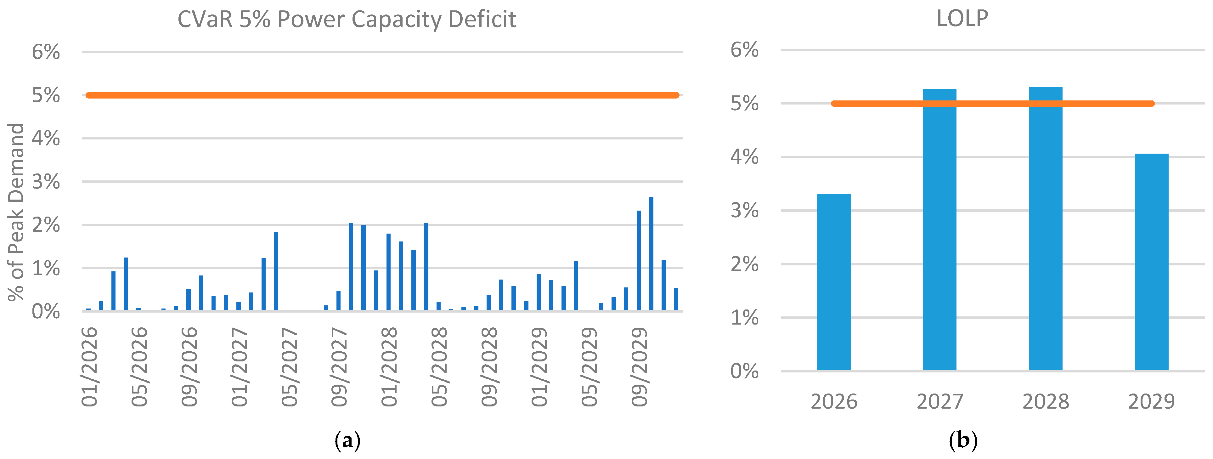 Figure 9, respectively. These refer to the most critical scenario for service, which has greater demand and greater thermoelectric inflexibility (Scenario 12 GW gas, with reference demand: GDP + 2.7%). Although small violations of LOLP are observed in