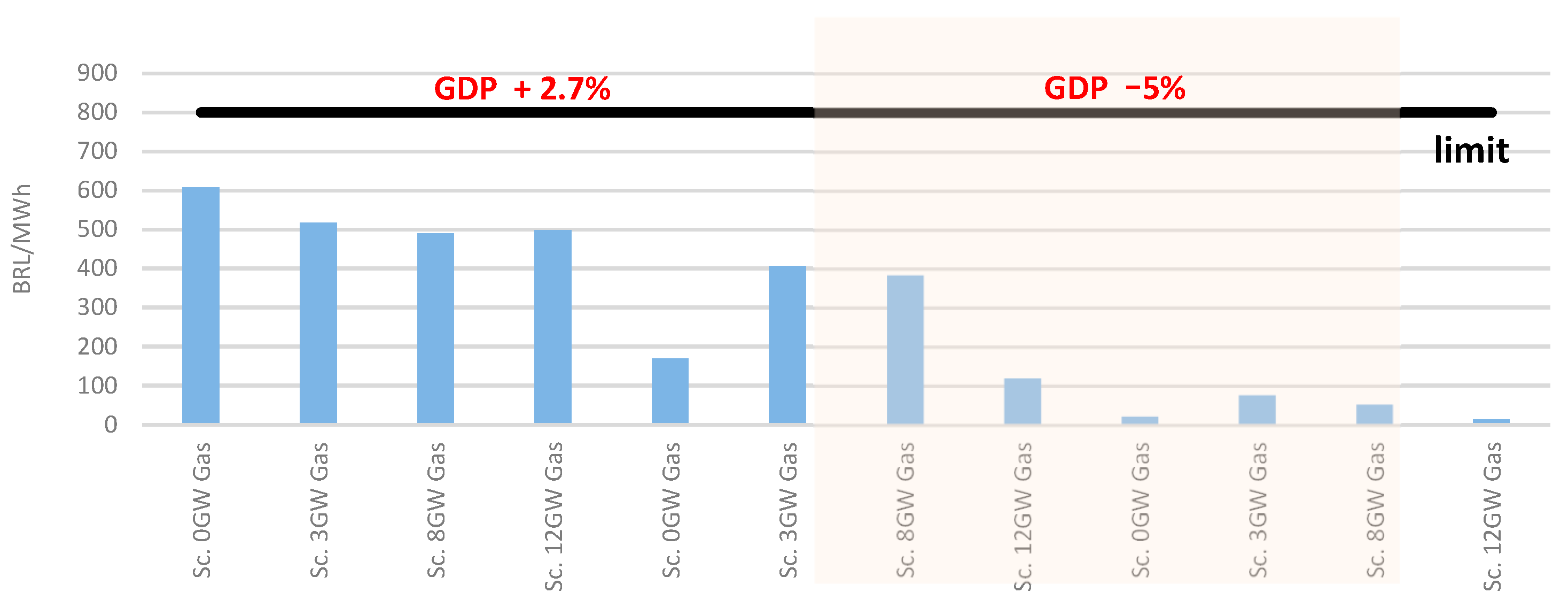 Regarding the first analysis, the impact of this obligation on operating and investment costs (reflected in the charges paid by the consumers) will be assessed when a sharp drop in demand is observed. Different levels of participation of natural gas thermoelectric power plants were considered, with 50% compulsory annual generation—as proposed by the ministry, at an operating cost of USD 5.00/MMBTu. This is equivalent to a variable cost (VC) of BRL 193/MWh and an investment cost of BRL 5000/kW [