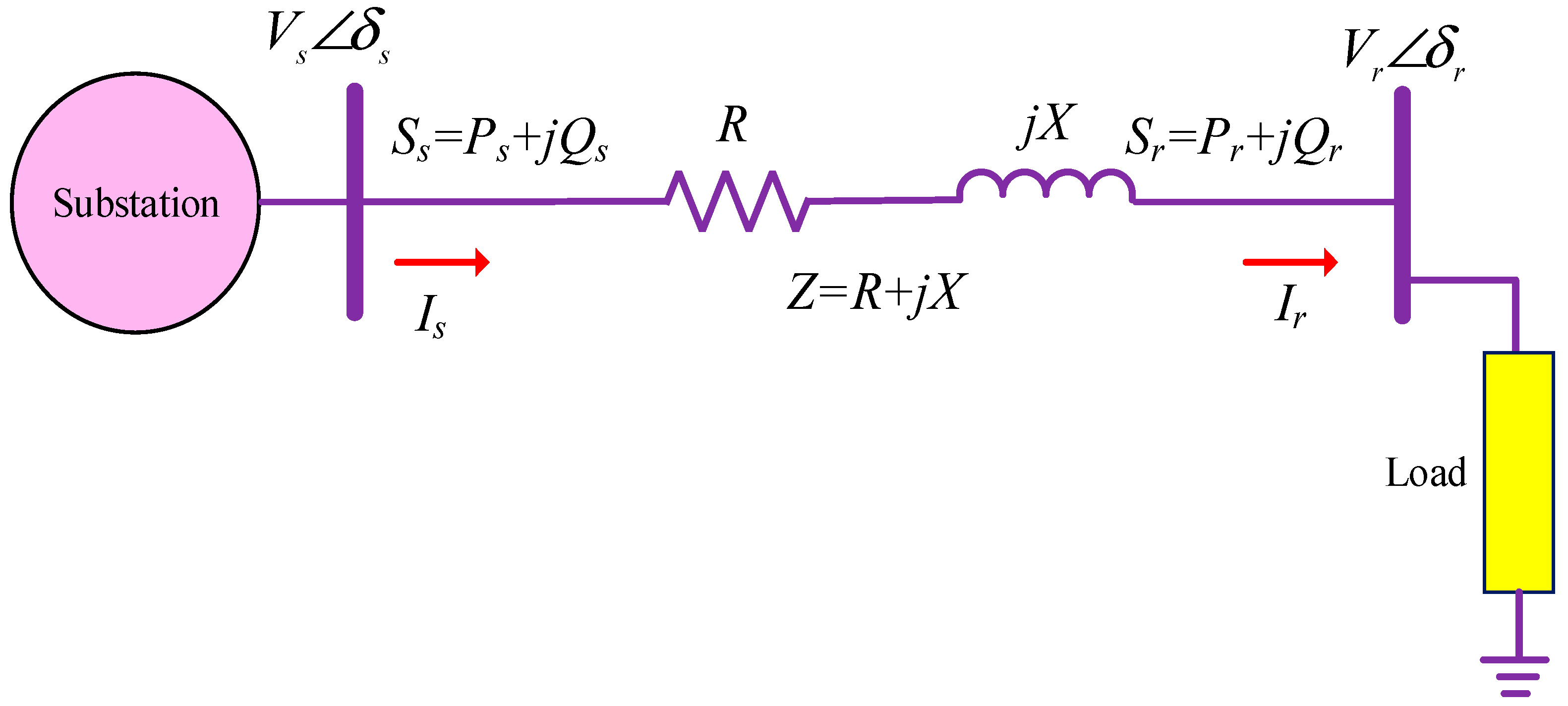 Figure 1, with the substation located at bus-s and the load placed at bus-r. Because the