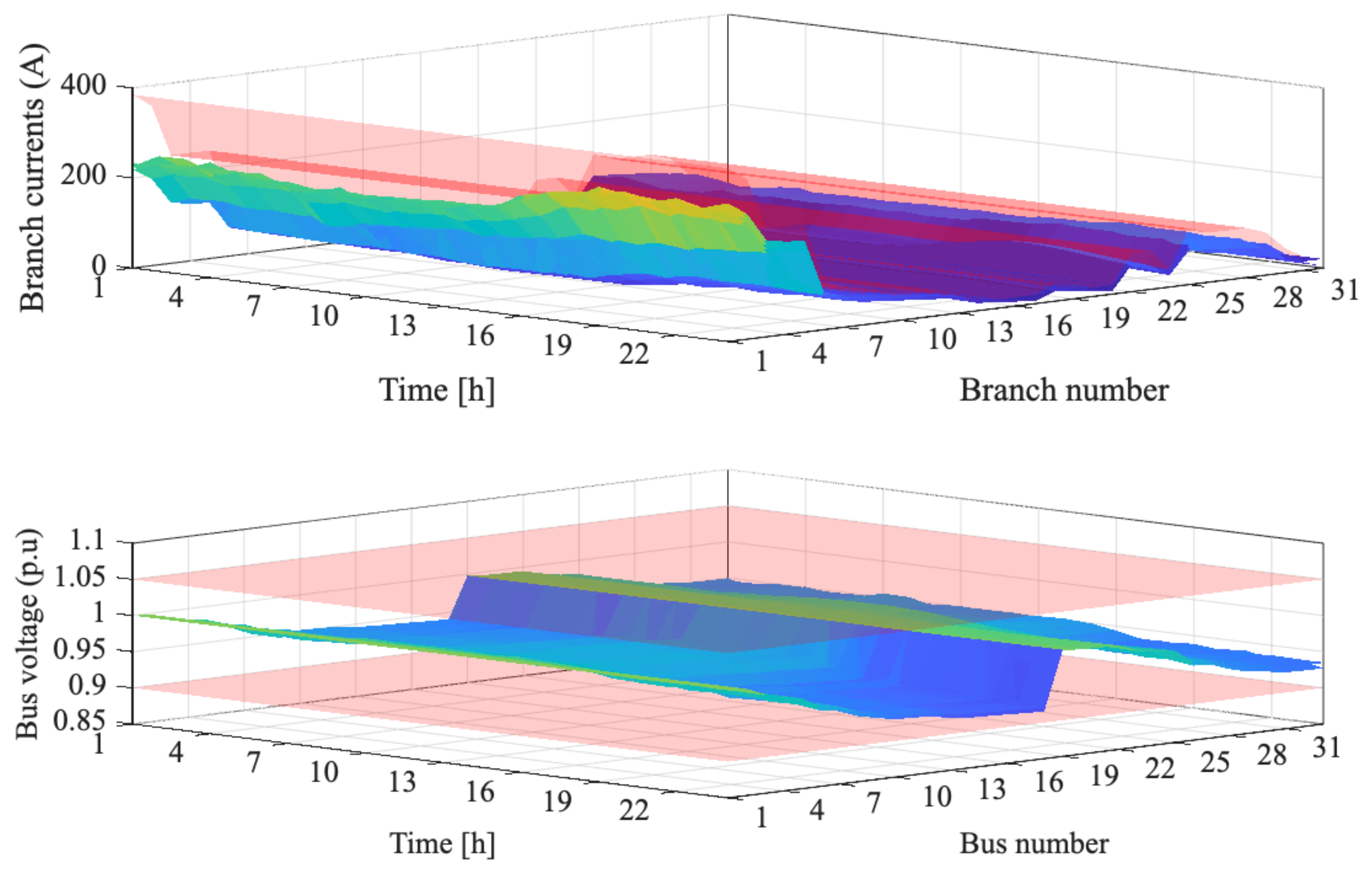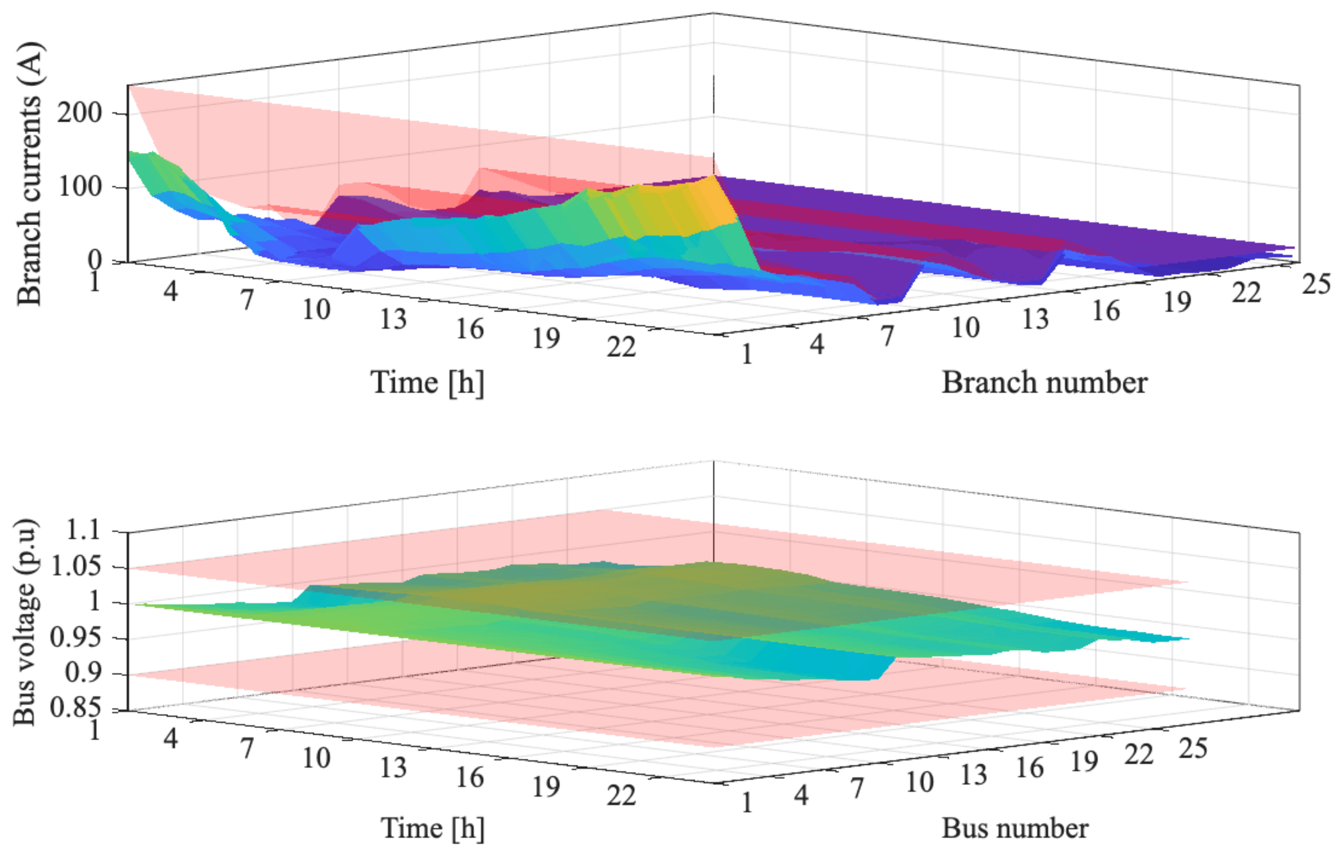 | 14: | Check current constraints on lines (Equation (13)) and voltage limits (Equation (11)). |