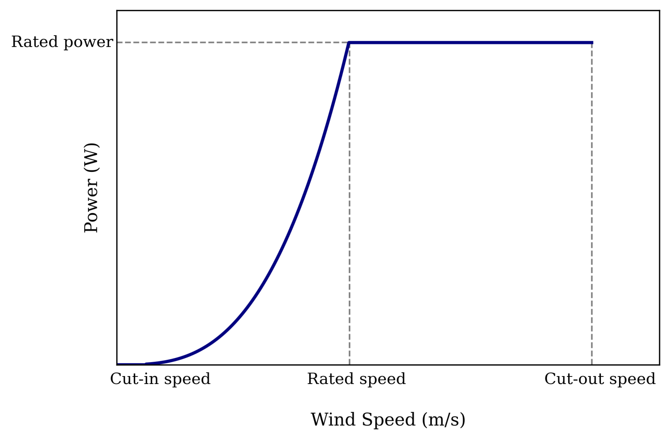 1) is greater than the aforementioned rated electrical power, the electrical power actually produced is equal to that rated value. Some important values of wind speed, related to the power generation of the wind turbine, are also noted: Firstly, the