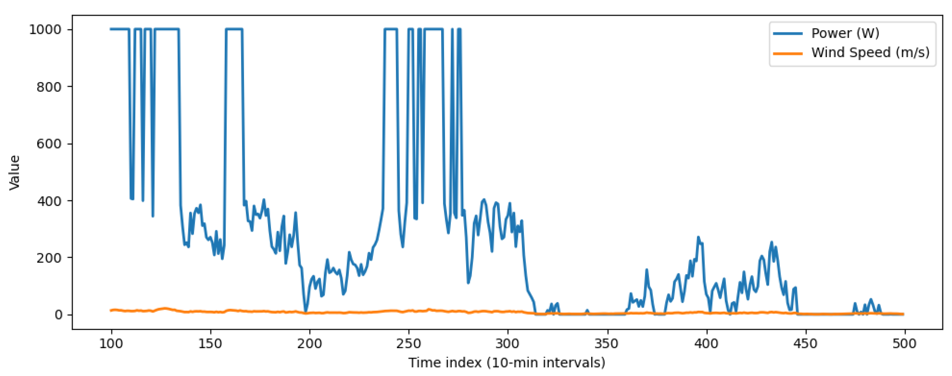 Figure 2 illustrates the time series of both the turbine’s electrical power output and the corresponding wind speed over a representative portion of the dataset.