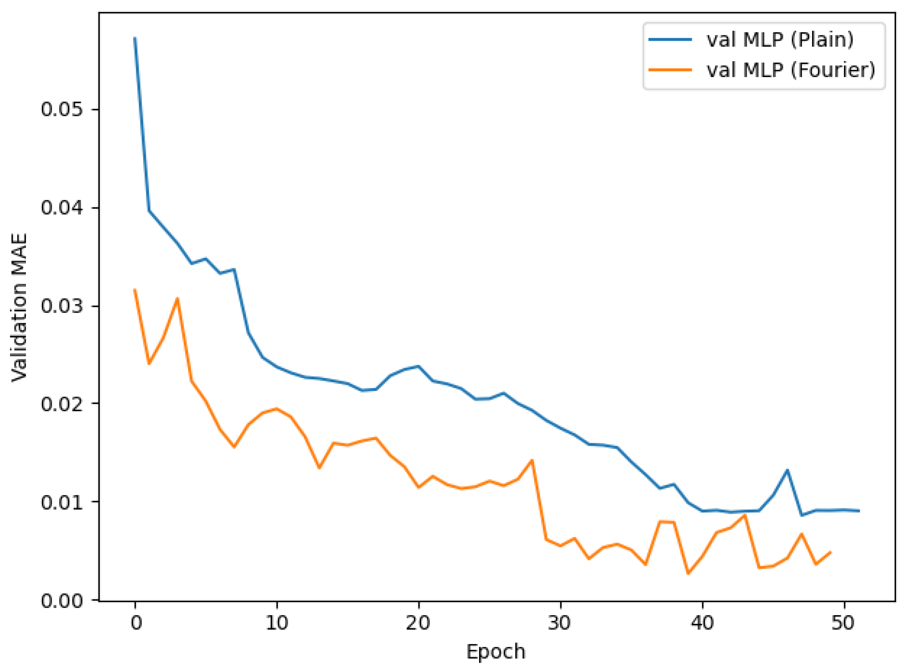 Figure 5, which shows the evolution of the validation MAE (computed on normalized outputs) across epochs for both models. It is evident that the plain-input MLP converges slowly and stabilizes at a higher validation error, while the Fourier feature MLP exhibits both faster convergence and consistently lower validation error. These observations are fully consistent with the error metrics of
