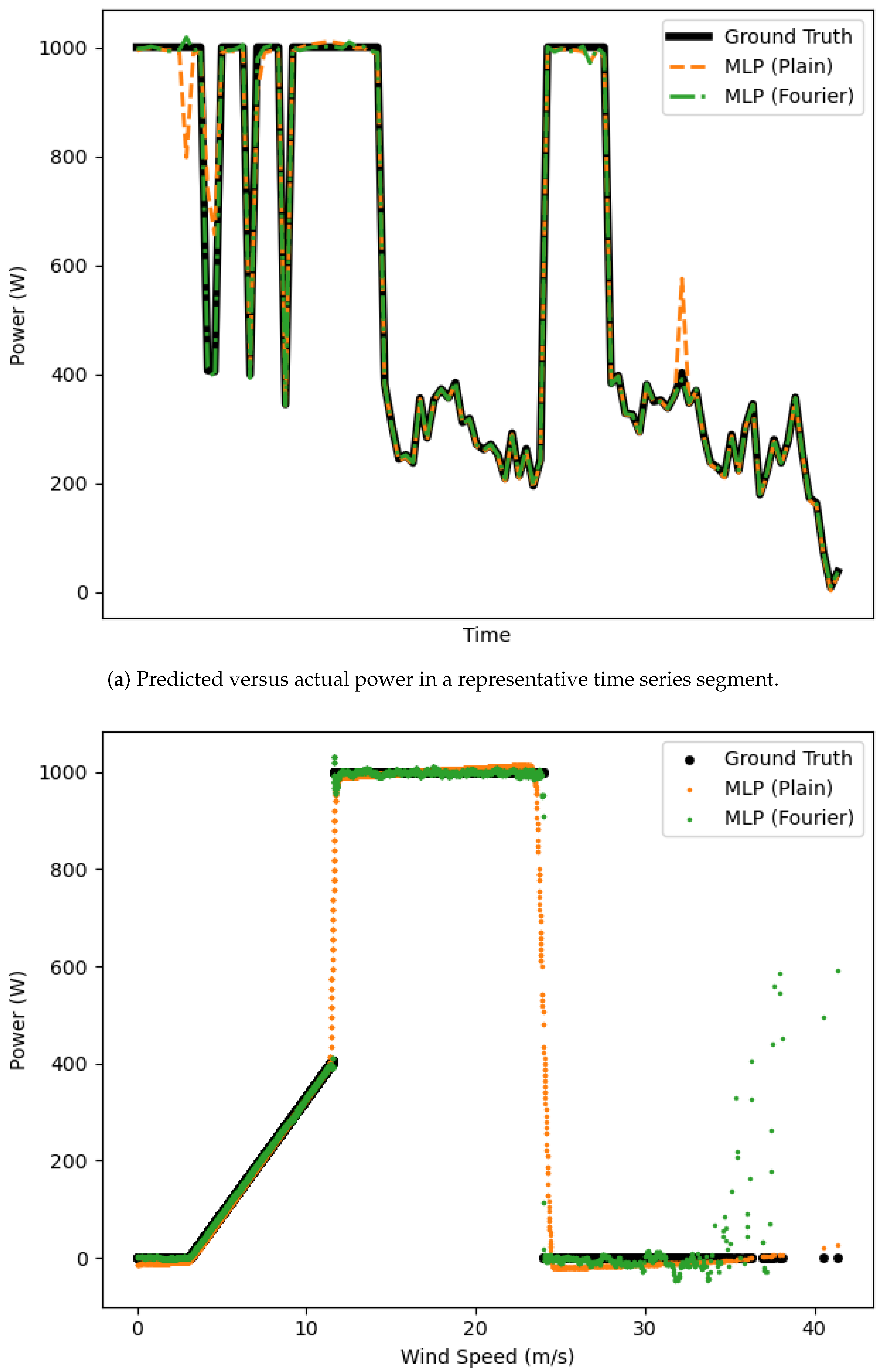Figure 6b, which presents the scatter plot of estimated power against wind speed. The plain MLP (orange) approximates the power curve reasonably well, but introduces discrepancies around the cut-in, rated, and cut-out regions. These regions are characterized by abrupt non-linearities that plain-input networks tend to smooth out. On the other hand, the FFE-MLP (green) almost exactly overlaps with the ground truth, showing only minor deviations at extreme wind speeds. In particular, a few scattered predictions appear above the cut-out region, which are inconsistent with turbine physics, as power generation must be strictly zero beyond the safety threshold. This can be remedied by applying a simple corrective rule, according to which the predicted power values are clamped to zero slightly beyond the nominal cut-out speed—acknowledging that this threshold is not precisely defined and may vary across turbine models and operating conditions. With this adjustment, the Fourier-based model remains both highly accurate and physically consistent. This confirms that Fourier features effectively mitigate spectral bias, enabling the model to learn both the cubic relationship of Equation (