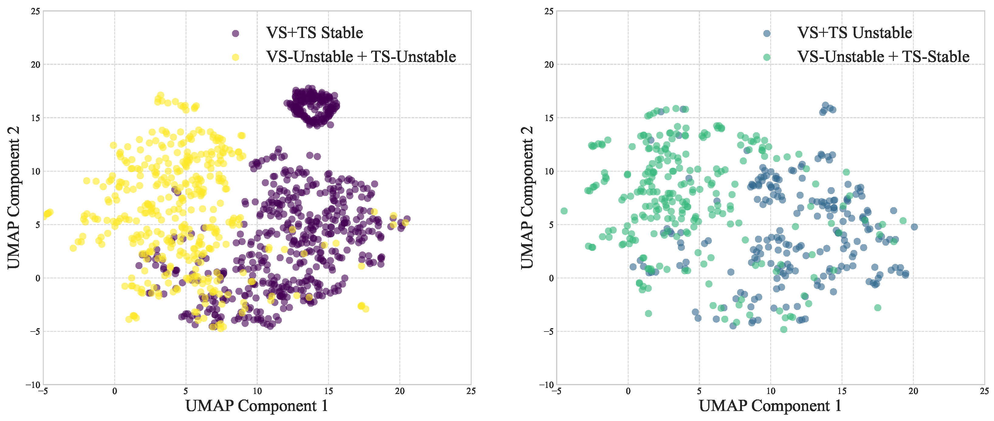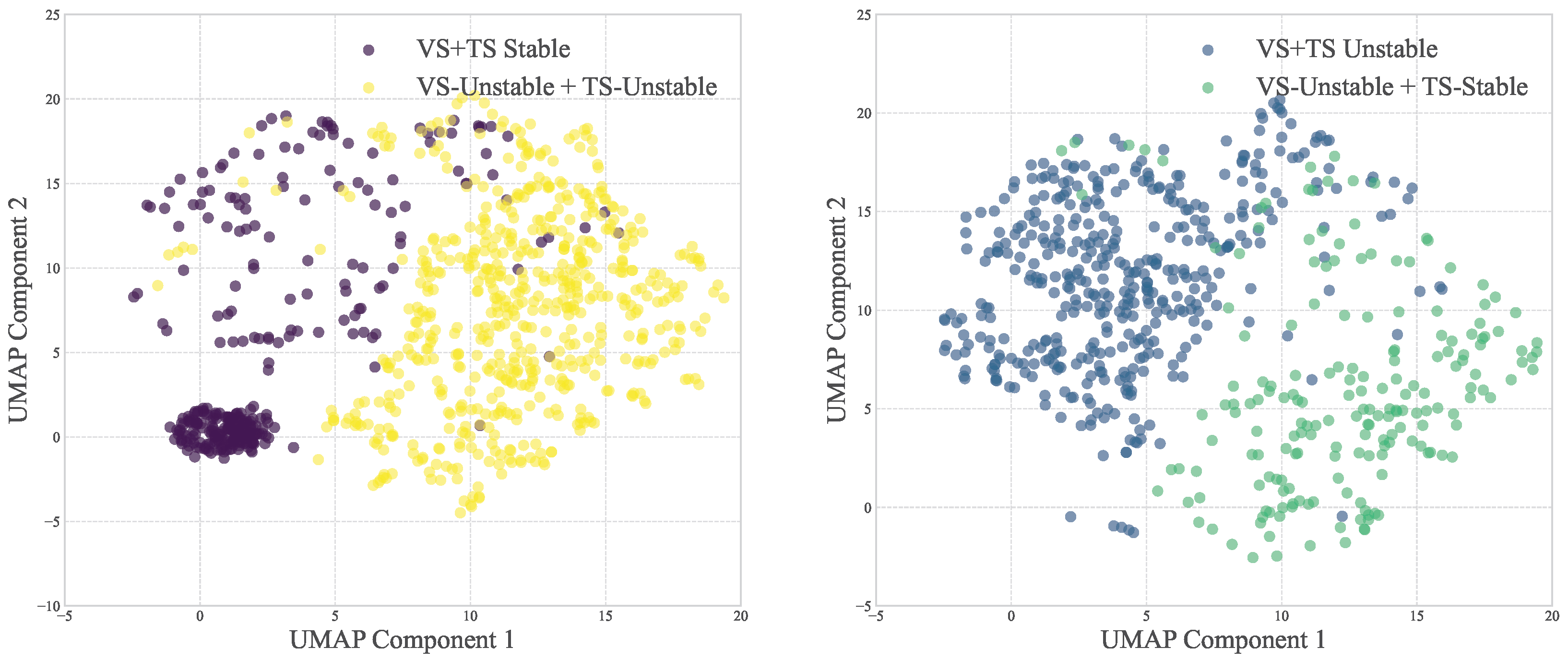 In-sample dataset GCN encoder representation quality. Two-dimensional UMAP projection of supervised contrastive GCN features showing clear cluster separation among stable, unstable, voltage-unstable, and transient-unstable feature labels.